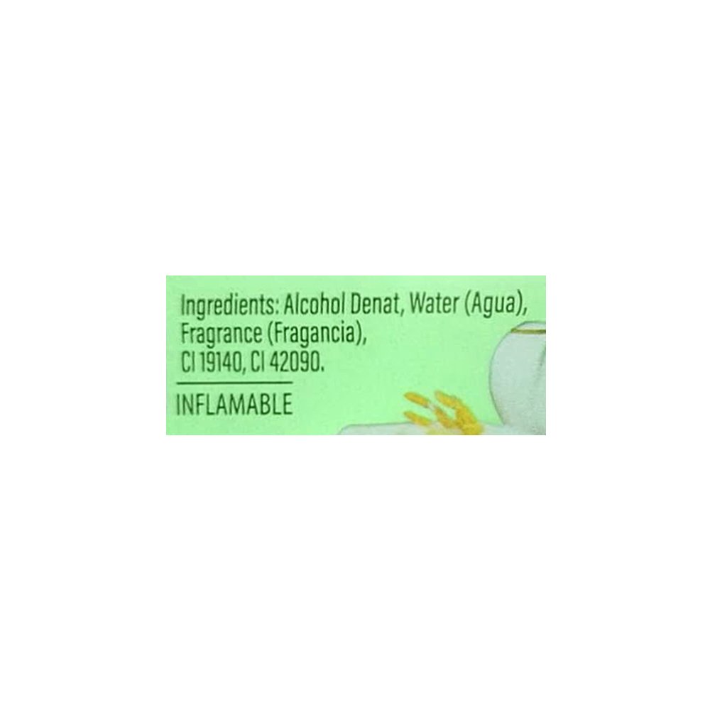 Ingredientes: Agua, alcohol desnaturalizado, fragancia, CI 19140, CI 42090