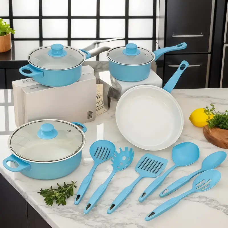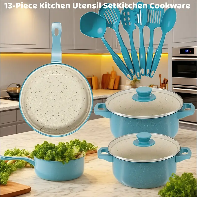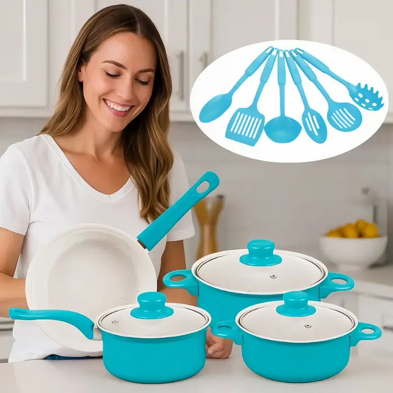 «¡Cocina saludable a precio increíble! Set de 13 piezas antiadherentes y no tóxicas, incluye olla para sopa, sartén y utensilios esenciales. Perfecto para regalar o equipar tu cocina. ¡Solo $12.12! 🍳🥘»